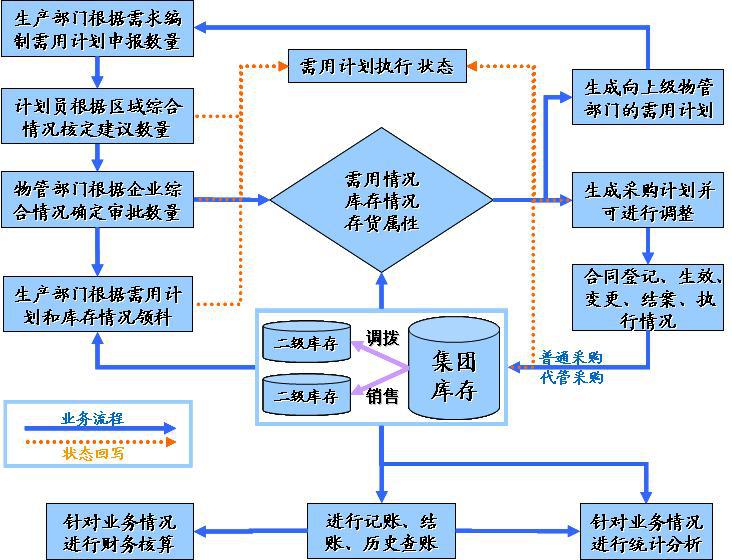 物资管理是集团管理中的重要环节之一,涉及到需用计划管理、库存管理、采购计划管理、采购的组织、物资的供应以及采购计划完成情况分析、需用计划完成情况分析、合同的签订及完成情况分析等。业务流程如下:
